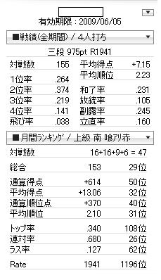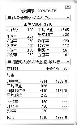 あと、リーチが全然勝てない。つぶされる。追っかけに上がられる。リーチを掛ける基準をまず下げるべきか。あがれない満貫よりあがれる3900って言うけど、そうも引けないよなぁ。デジタルを貫くなら、今の基準だと思うのだが。